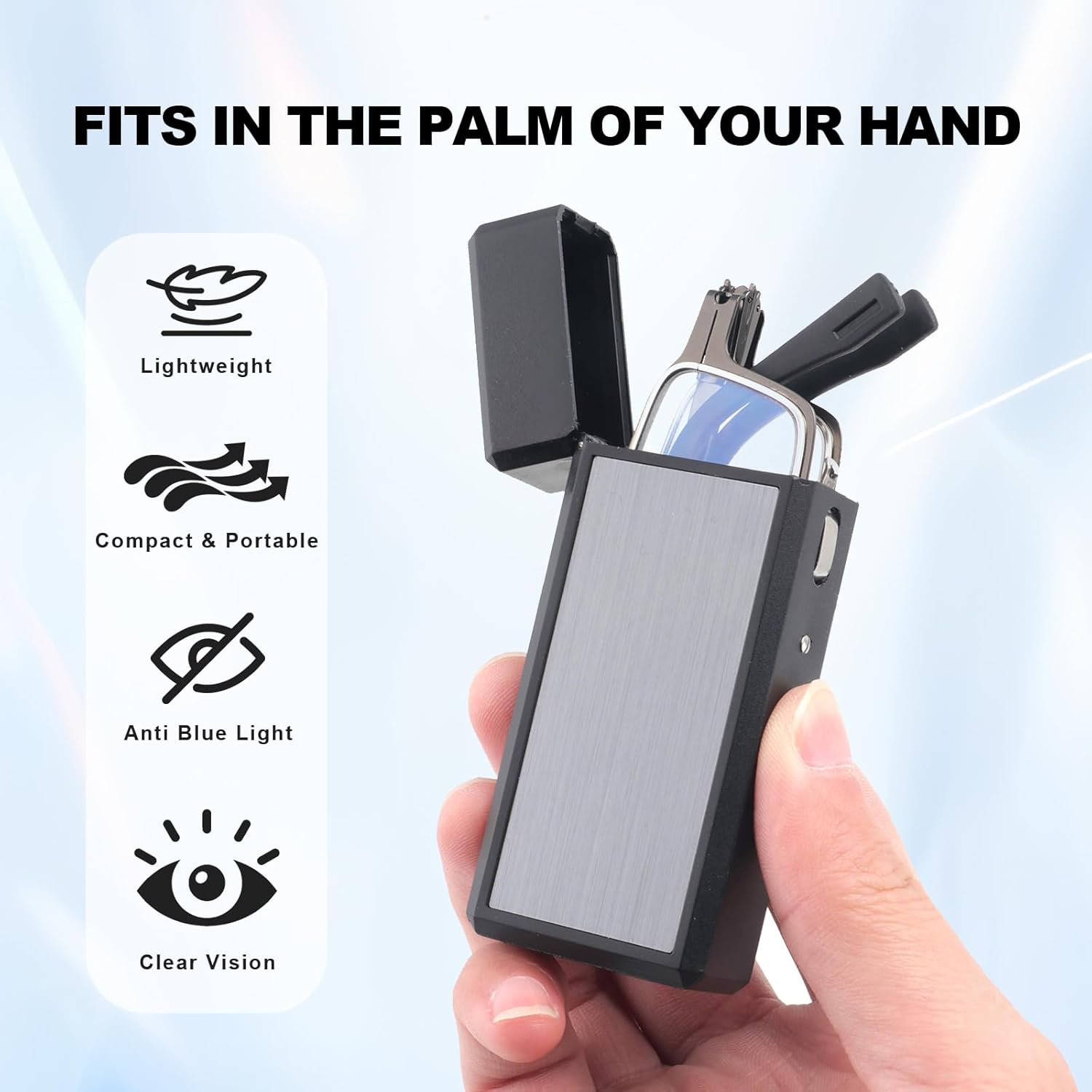 1 thin and hard glasses case with a soft protective film that fits the box body, which can prevent lens scratches and glasses shaking; There are metal buttons on the side of the storage box for easy and quick removal of glasses