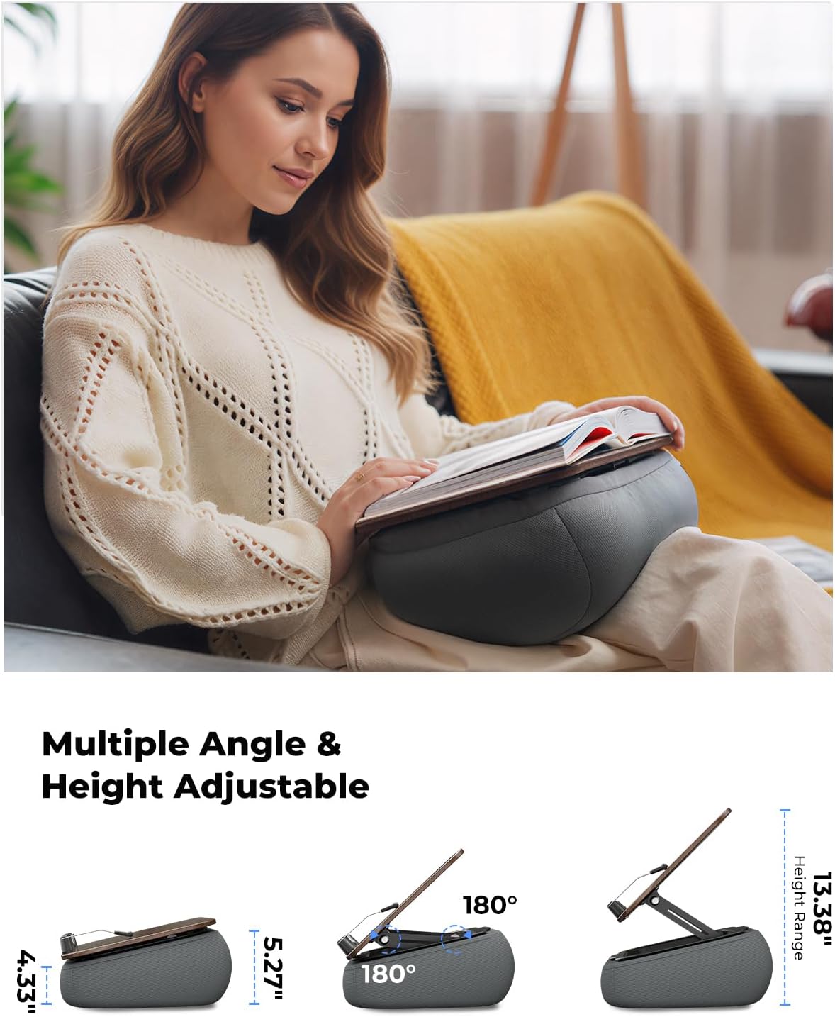 The adjustable support arm delivers 180° angle flexibility, letting you set the perfect viewing height(up to13.38”) and angle. Ideal as a book stand for reading in bed, tablet stand, or lap desk pillow that helps reduce neck and shoulder strain during long reading or study sessions.