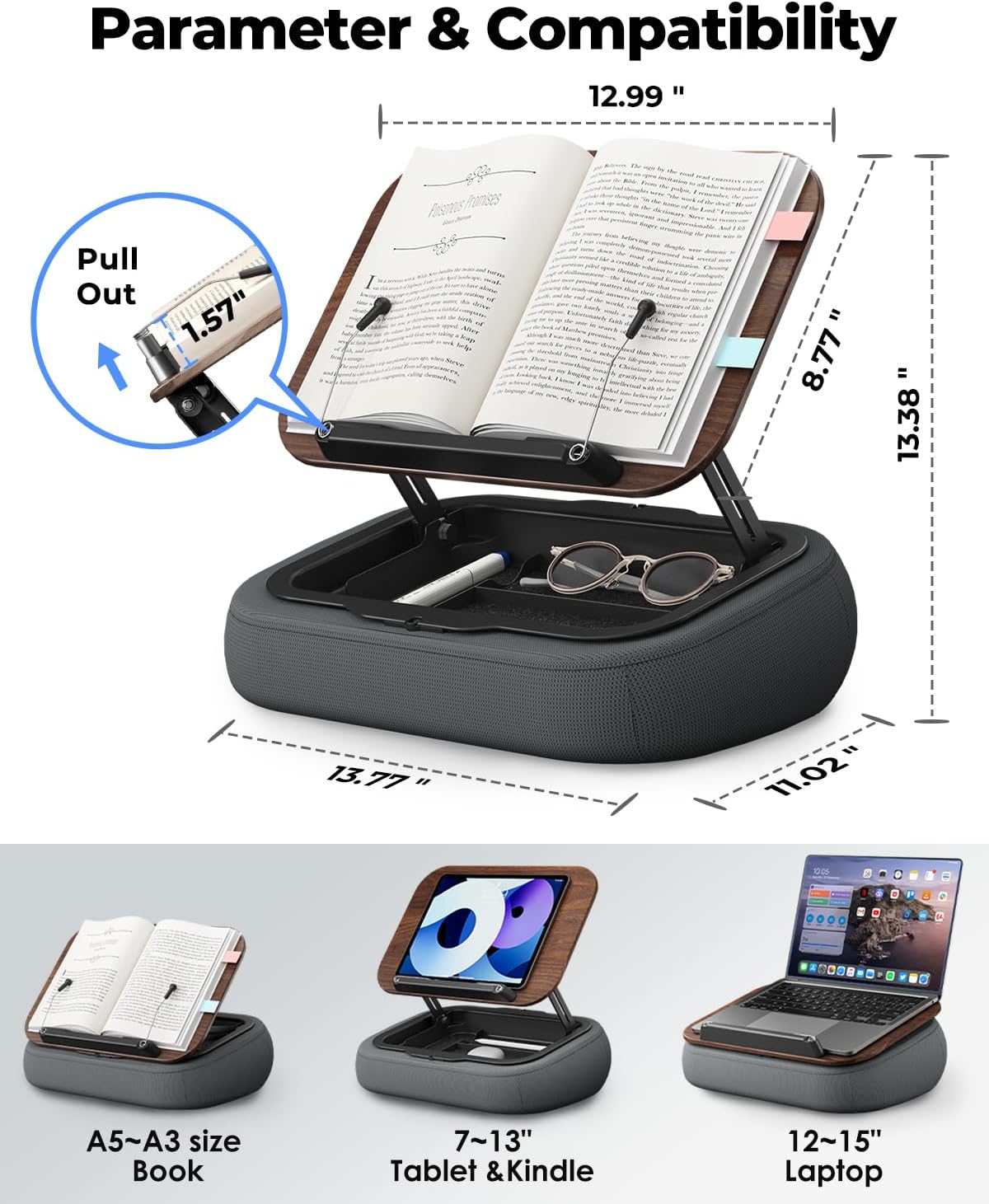 The sturdy dark wood panel fits A5–A3 books, thick hardcovers, tablets, and e-readers. The two-stage page clamp (up to 1.57”) securely holds thick books—making it an excellent book stand / book holder for bed and sofa.