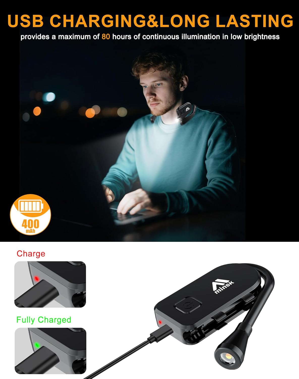 This book light is equipped with an internal 400mAh battery, requiring approximately 2 hours for a full charge. At the minimum brightness level, it provides a maximum of 80 hours of continuous illumination.