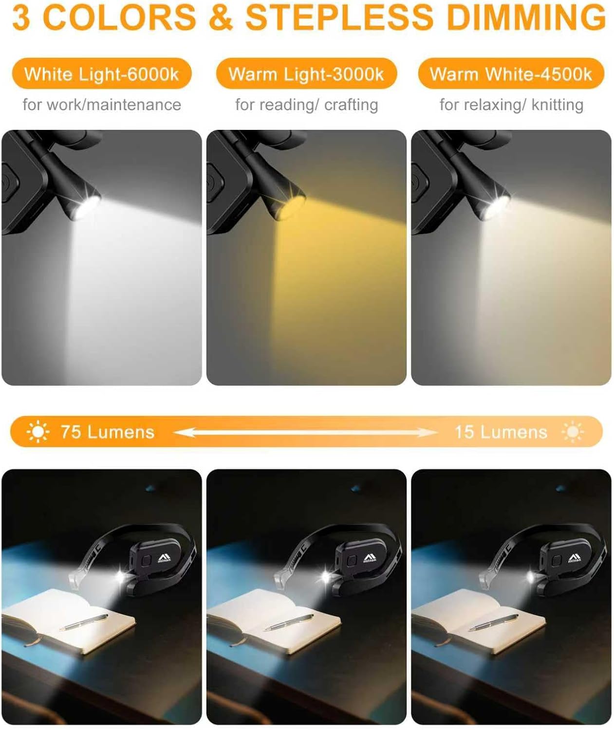 Designed for book lovers, this neck light offers three tailored lighting options: warm 3000K glow for relaxed bedtime reading, 4000K warm white for comfortable daytime use, and bright 6000K white for focused reading sessions. A quick tap on the color button switches your preferred mode, while a long hold on the brightness control lets you adjust the light level seamlessly from 10% to 100%.
