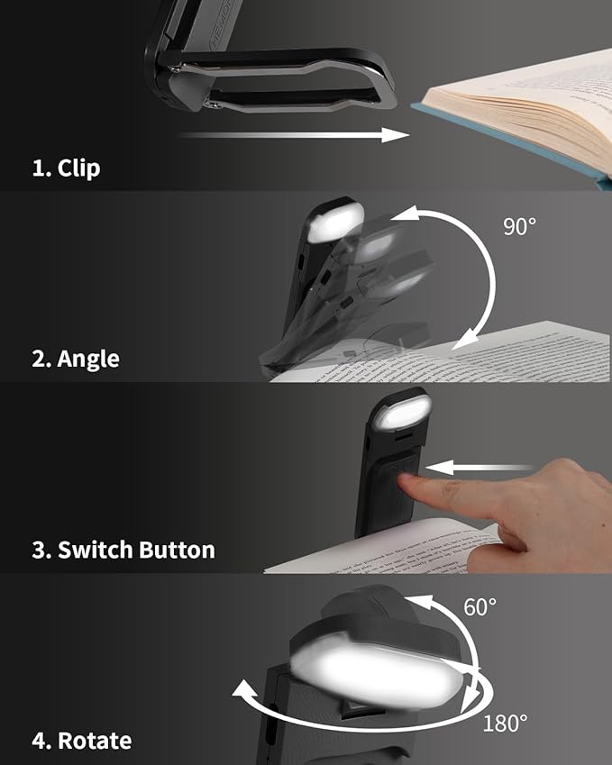 Enjoy eye-friendly reading anytime, anywhere with this rechargeable clip-on booklight.